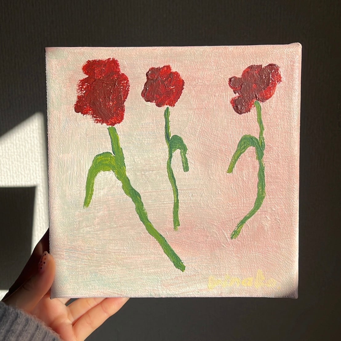 パールのような光沢のある絵の具を使用しており、光の当たり方によって表情が変わる作品です。